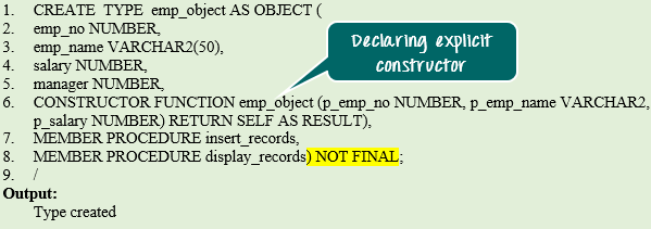 - 代码行 1-9:创建 'emp_object' 对象类型,包含 4 个属性和 3 个成员。它包含只有 3 个参数的构造函数的定义。它被声明为 'NOT FINAL',因此它是父类型。