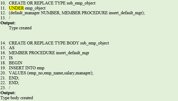 CREATE OR REPLACE TYPE sub_emp_object UNDER emp_object (default_manager NUMBER,MEMBER PROCEDURE insert_default_mgr); / CREATE OR REPLACE TYPE BODY sub_emp_object AS MEMBER PROCEDURE insert_default_mgr IS BEGIN INSERT INTO emp VALUES(emp_no,emp_name:salary,manager): END; END; /
