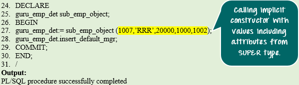 DECLARE guru_emp_det sub_emp_object; BEGIN guru_emp_det:= sub_emp_object(1007,'RRR',20000,1000,1002); guru_emp_det.insert_default_mgr; COMMIT; END; /