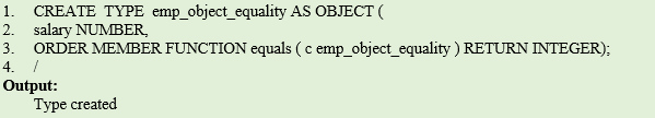 CREATE TYPE emp_object_equality AS OBJECT( salary NUMBER, ORDER MEMBER FUNCTION equals(c emp_object_equality)RETURN INTEGER); /