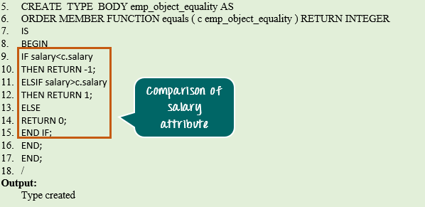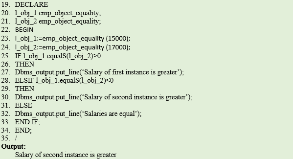 DECLARE l_obj_l emp_object_equality; l_obj_2 emp_object_equality; BEGIN l_obj_l:=emp_object_equality(15000); l_obj_2:=emp_object_equality(17000); IF l_obj_1.equalS(l_obj_2)>0 THEN Dbms_output.put_line(’Salary of first instance is greater’): ELSIF l_obj_l.equalS(l_obj_2)<0 THEN Dbms_output.put_line(’Salary of second instance is greater’); ELSE Dbms_output.put_line(’Salaries are equal’); END IF; END; /