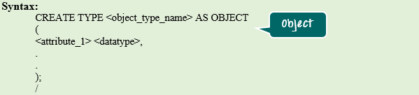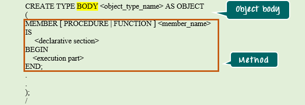 CREATE TYPE<object_type_name> AS OBJECT ( <attribute_l><datatype>, . . ); / CREATE TYPE BODY<object_type_name> AS OBJECT ( MEMBER[PROCEDURE|FUNCTION]<member_name> IS <declarative section> BEGIN <execution part> END; . . ); /