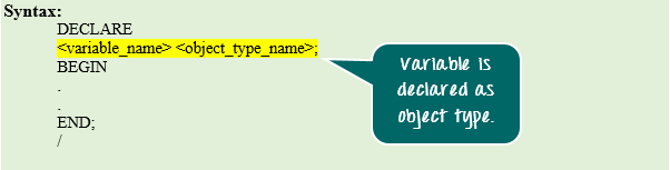 DECLARE <variable_name> <object_type_name>; BEGIN . . END; /