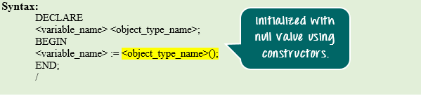 DECLARE <variable_name> <object_type_name>; BEGIN <variable_name>:=<object_type_name>(); END; /