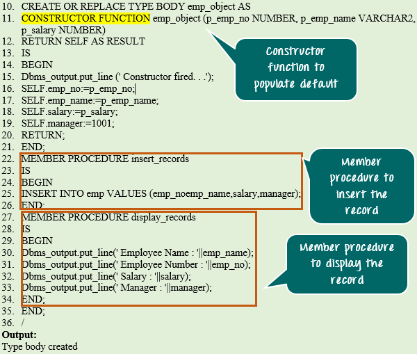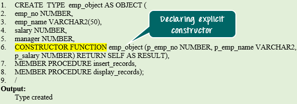 CREATE TYPE emp_object AS OBJECT( emp_no NUMBER, emp_name VARCHAR2(50), salary NUMBER, manager NUMBER, CONSTRUCTOR FUNCTION emp_object(p_emp_no NUMBER, p_emp_name VARCHAR2, p_salary NUMBER) RETURN SELF AS RESULT), MEMBER PROCEDURE insert_records, MEMBER PROCEDURE display_records); /