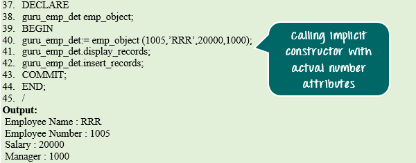 DECLARE guru_emp_det emp_object; BEGIN guru_emp_det:=emp_object(1005,’RRR',20000,1000); guru_emp_det.display_records; guru_emp_det.insert_records; COMMIT; END;