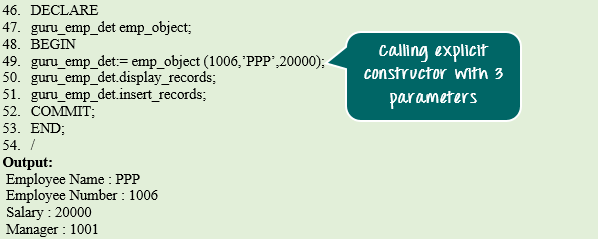 DECLARE guru_emp_det emp_object; BEGIN guru_emp_det:=emp_object(1006,'PPP',20000); guru_emp_det.display_records; guru_emp_det.insert_records; COMMIT; END; /