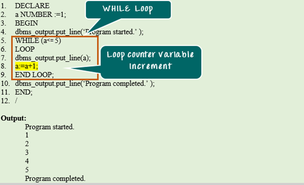 - 代码行 9:关键字‘END LOOP’标记执行块的结束。
