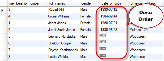 假设市场部门希望按出生日期降序排列会员详细信息。这将有助于他们及时发送生日祝福。我们可以通过执行如下查询来获取该列表 –