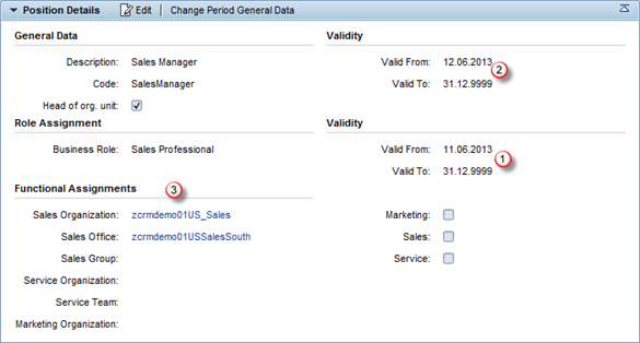 - 职能:此块表示组织单位/职位在组织结构中的职能,因此被视为销售组织、服务组织或营销组织