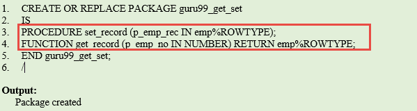 CREATE OR REPLACE PACKAGE guru99_get_set IS PROCEDURE set_record (p_emp_rec IN emp%ROWTYPE); FUNCTION get record (p_emp no IN NUMBER) RETURN emp%ROWTYPE; END guru99_get_set: /