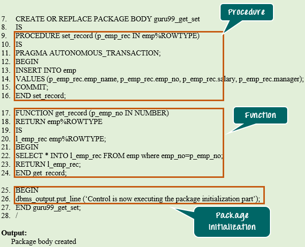 CREATE OR REPLACE PACKAGE BODY guru99_get_set IS PROCEDURE set_record(p_emp_rec IN emp%ROWTYPE) IS PRAGMA AUTONOMOUS_TRANSACTION; BEGIN INSERT INTO emp VALUES(p_emp_rec.emp_name,p_emp_rec.emp_no; p_emp_rec.salary,p_emp_rec.manager); COMMIT; END set_record; FUNCTION get_record(p_emp_no IN NUMBER) RETURN emp%ROWTYPE IS l_emp_rec emp%ROWTYPE; BEGIN SELECT * INTO l_emp_rec FROM emp where emp_no=p_emp_no RETURN l_emp_rec; END get_record; BEGUN dbms_output.put_line(‘Control is now executing the package initialization part'); END guru99_get_set: /
