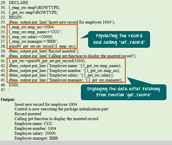 - 代码第 38 行:调用 guru99_get_set Package 的 'set_record'。现在 Package 已实例化,并将一直存在直到会话结束。