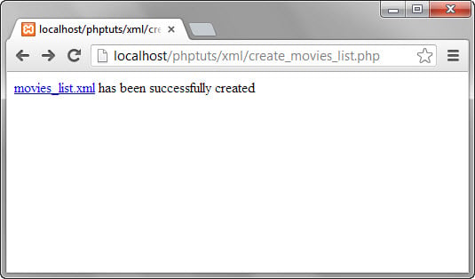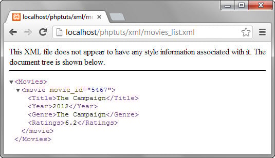 假设您将 create_movies_list 文件保存在 phptuts/xml 文件夹中,请浏览到 URL https:///phptuts/xml/create_movies_list.php。
