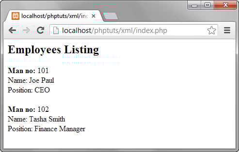 现在让我们编写代码来读取 employees XML 文档并在 Web 浏览器中显示结果。 Index.php