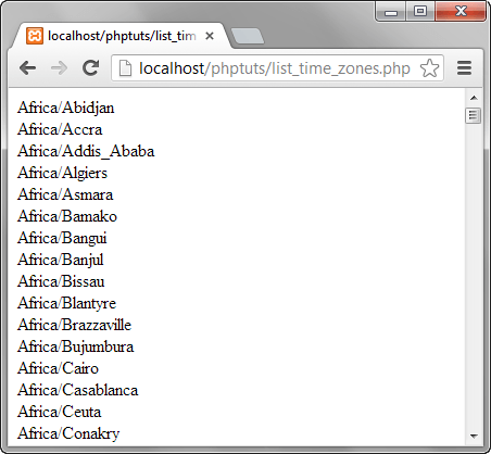 假设您将文件 list_time_zones.php 保存在 phptuts 文件夹中,请浏览到 URL https:///phptuts/list_time_zones.php