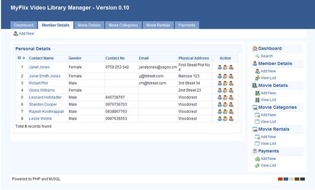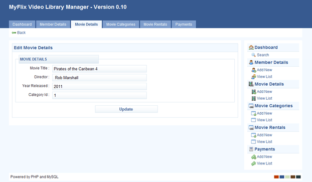 下面 PHP 与 MySQL 示例的截图显示了在 Myflixdb 之上运行的视频库应用程序的外观。