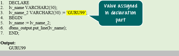 DECLARE lv_name VARCHAR2(50); lv_name_2 VARCHAR2(50) := ‘GURU99'; BEGIN lv_name := lv_name_2; dbms_output .put_line(lv_name); END: