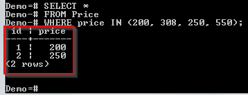 我们创建了一个包含 4 个数字的列表。我们正在检查是否可以将这些值中的任何一个与 Price 表的 price 列中的值匹配。匹配了两个值,并返回了它们的详细信息。