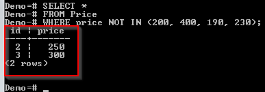 我们创建了一个包含 4 个数字的列表。我们正在检查 Price 表的 price 列中不属于该列表的值。未找到两个值:250 和 300。因此,已返回它们的详细信息。