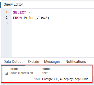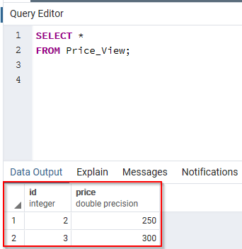 视图已被命名为 Price_View2,并且只包含 Price 表的价格列。让我们查询视图以查看其内容
