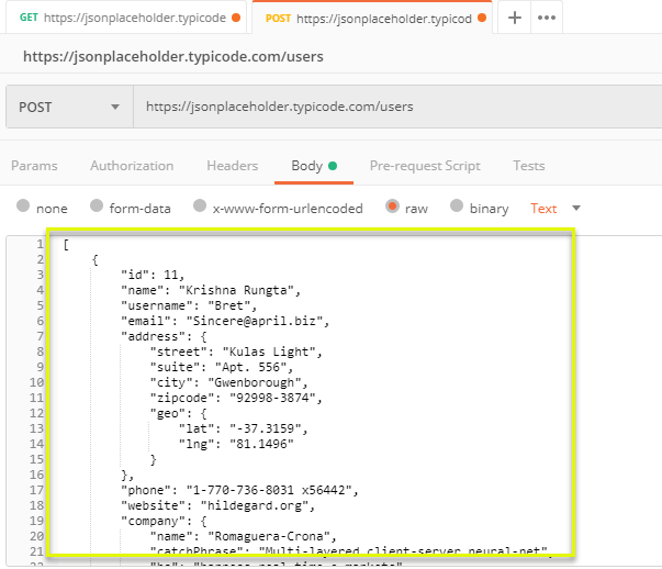 步骤 4) 从之前的 get 请求中复制并粘贴一个用户结果,如下所示。确保代码已正确复制,花括号和方括号都配对。将 id 更改为 11,并将 name 更改为任何你想要的名字。你也可以更改地址等其他详细信息。