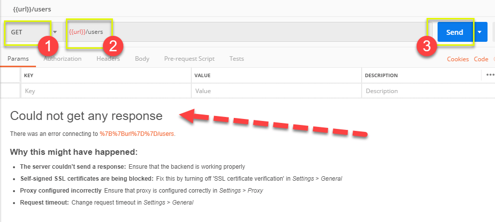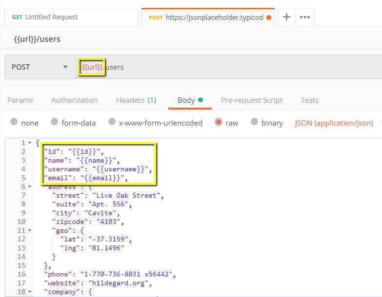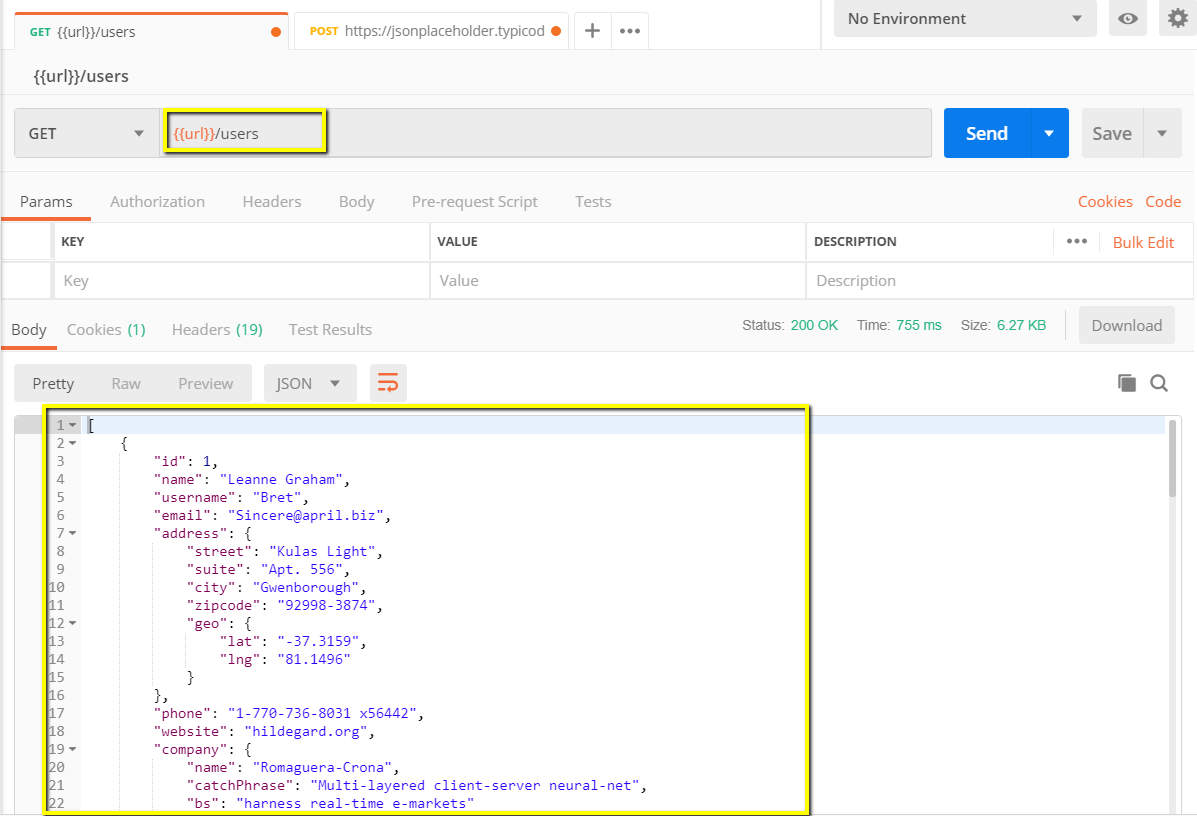 - 输入此链接:https://jsonplaceholder.typicode.com/users。将链接的第一部分替换为一个参数,例如 {{url}}。请求 URL 现在应该是 {{url}}/users。
