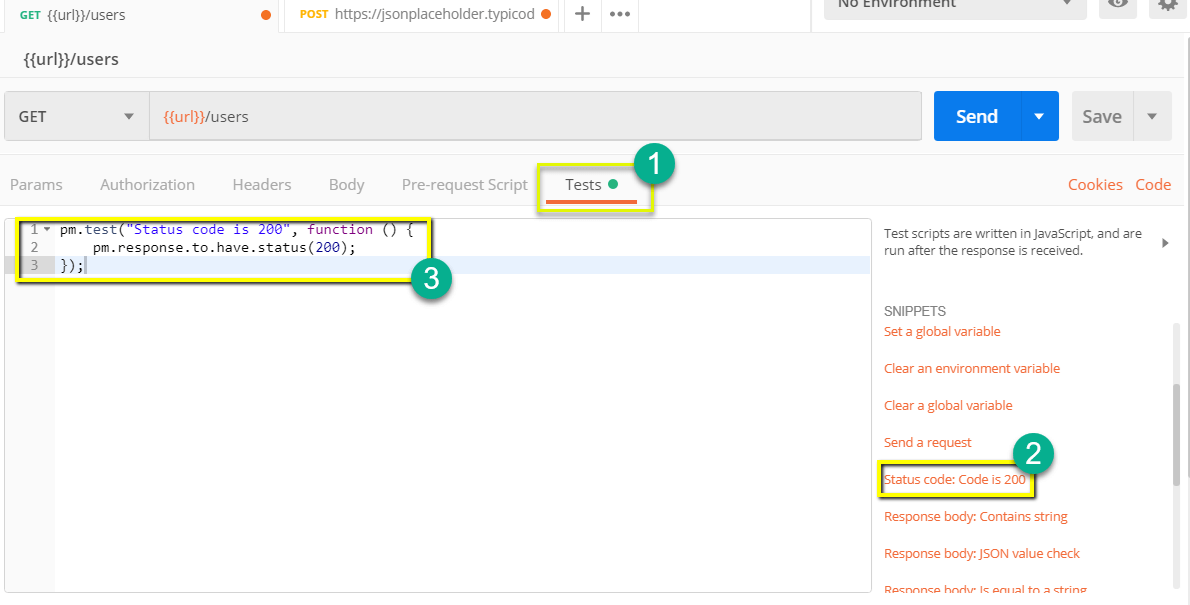 - 创建测试 – 可以为每个 Postman API 调用添加测试检查点,例如验证 HTTP 响应状态是否成功,这有助于确保测试覆盖率。