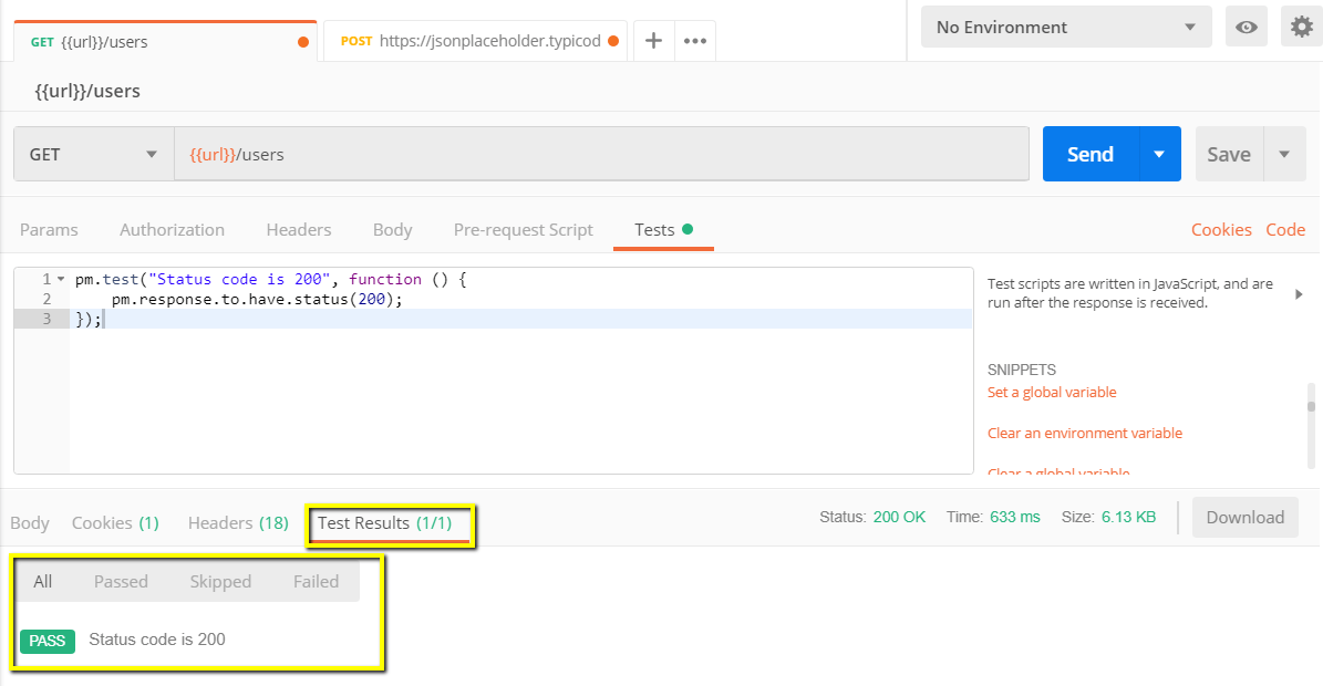 步骤 5) 点击发送。现在你的请求应该有两个通过的测试结果。