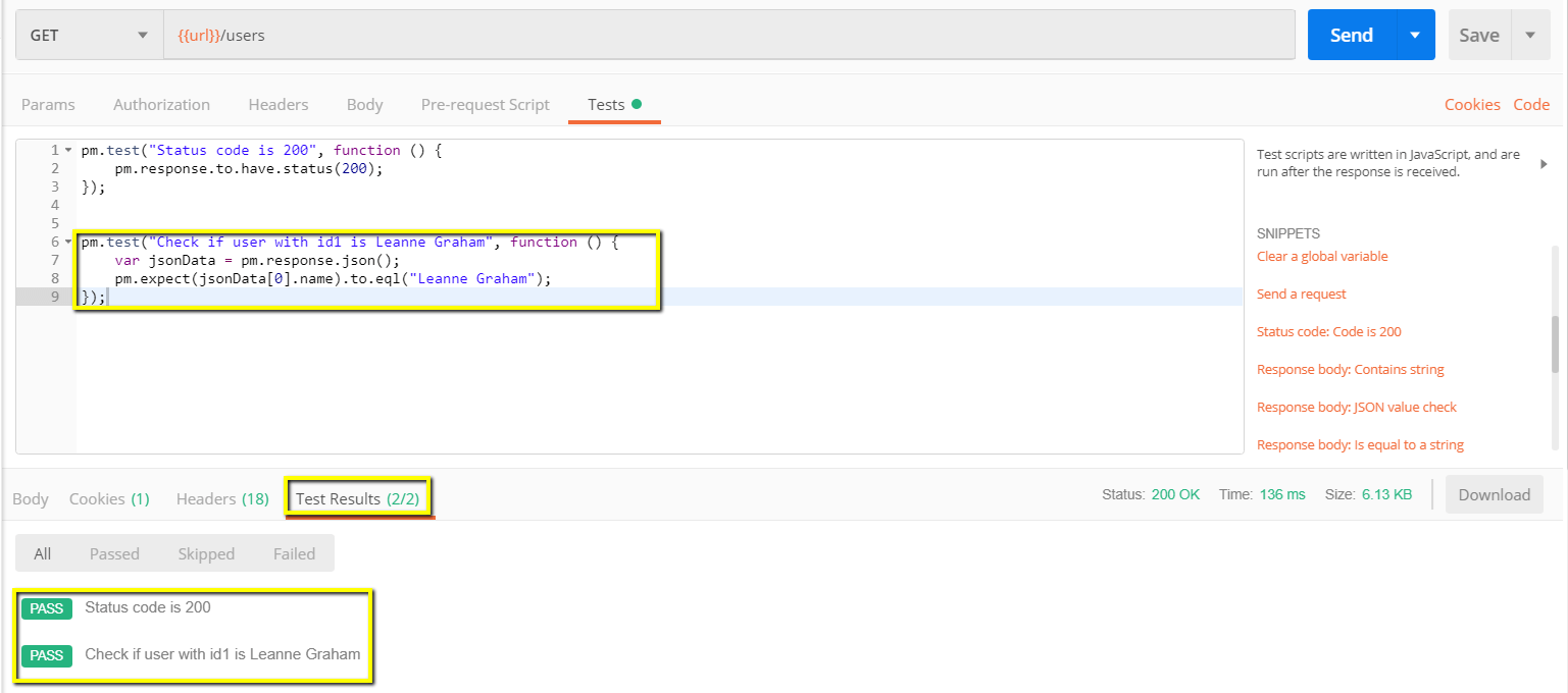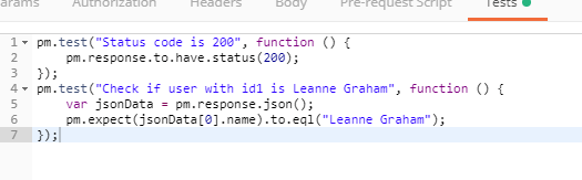 pm.expect(jsonData[0].name).to.eql("Leanne Graham");