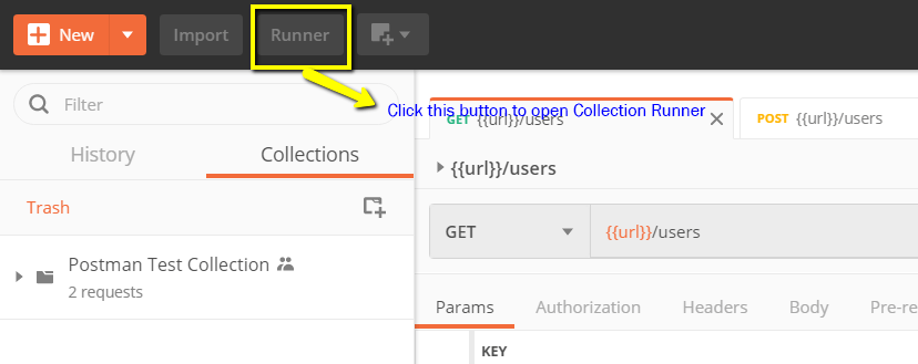 步骤 1) 点击页面顶部“Import”按钮旁边的“Runner”按钮。