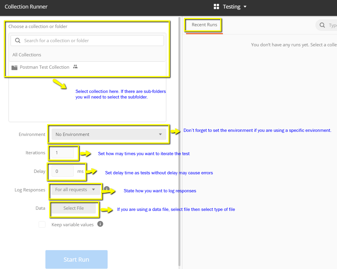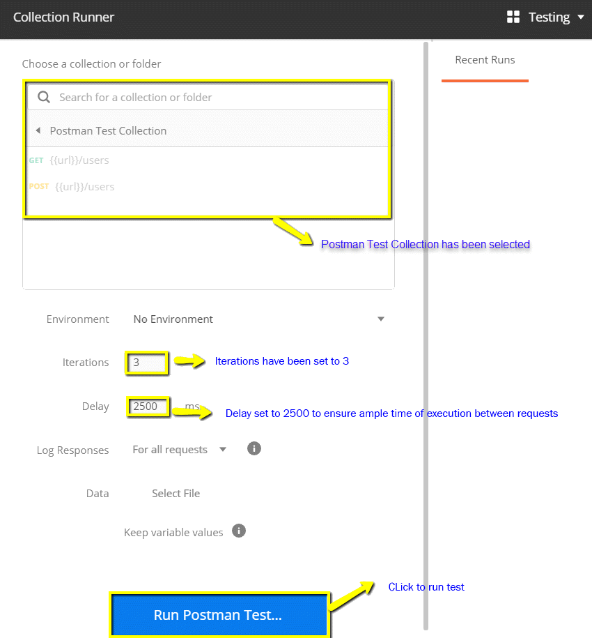 步骤 3) 通过设置以下内容来运行您的 Postman 测试集合
