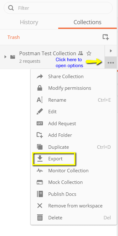步骤 3) 一旦 Newman 安装完毕,让我们回到 Postman 工作区。在 Collections 框中,点击三个点。现在应该会出现选项。选择 Export。
