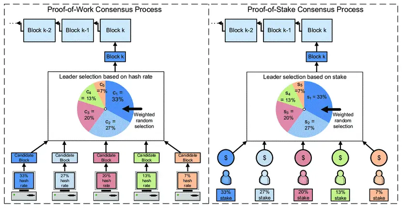 - 比较 PoW 与 PoS,PoW 需要强大且最新的挖掘硬件,而 PoS 则需要服务器级别的单元进行高效处理。