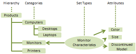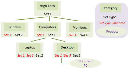 - 产品可以分配给这些类别中的任何一个。分配给某个类别的产品会从可用的 Set Types(即当前类别及其更高级别类别的 Set Types)获取属性。