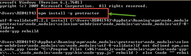 步骤 1)打开命令提示符,输入“npm install –g protractor”,然后按 Enter 键。