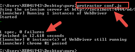 步骤 3)打开一个新的命令提示符,输入命令“protractor conf.js”来运行配置文件。
