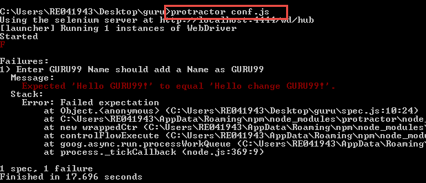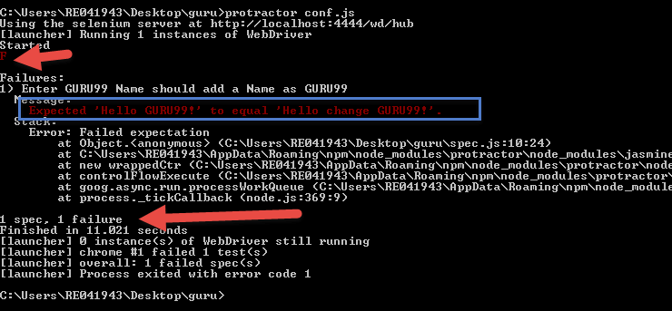 我们可以看到结果以屏幕截图中的“F”表示失败,原因为“Expected ‘Hello GURU99!’ to equal ‘Hello change GURU99!’”。它还显示了执行代码时遇到的失败次数。