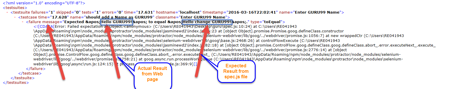 步骤 6)打开 XML 并验证结果。如我们的测试用例已失败,结果文件显示了失败消息。测试用例失败是因为“spec.js”中的预期结果与 Web 页面中的实际结果不匹配。