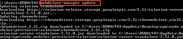步骤 3)更新 WebDriver 管理器。WebDriver 管理器用于在特定浏览器上运行针对 angular Web 应用程序的测试。Protractor 安装后,需要将 WebDriver 管理器更新到最新版本。这可以通过在命令提示符中运行以下命令来完成。