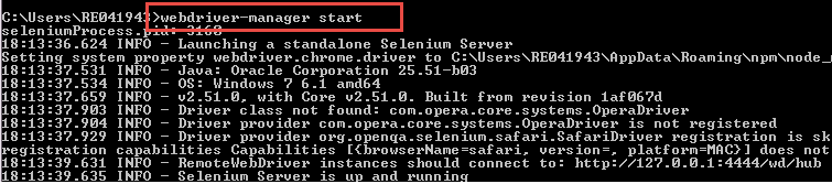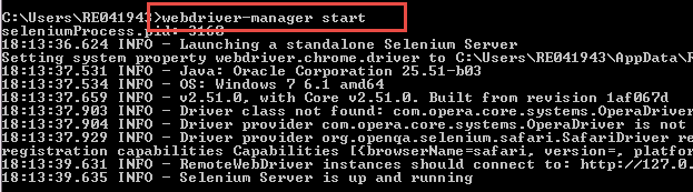 步骤 2)确保 Selenium WebDriver 管理器已启动并正在运行。为此,请输入命令“webdriver-manager start”并按 Enter 键。