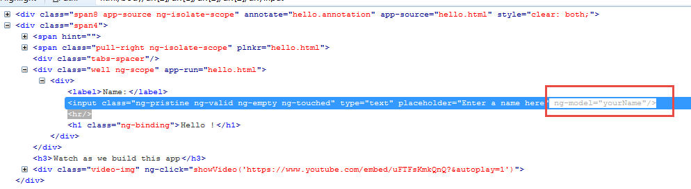 - element(by.model(‘yourName’)).sendKeys(‘GURU99’) 在这里,我们使用模型名称“yourName”来查找 Web 元素,这是网页上“ng-model”的值。请查看下图-