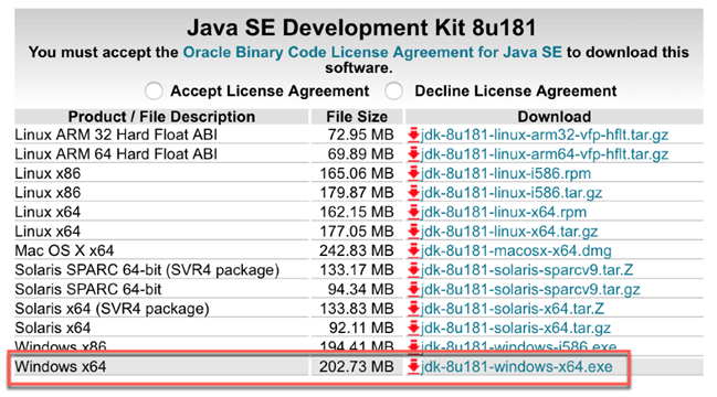 如果您需要安装 Java,请访问此 链接 并下载 jdk-8u181-windows-x64.exe