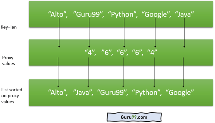 - 在这里,单词 alto 和 java 的长度为 4,它们首先在列表中排序,然后是 Guru99,长度为 6。