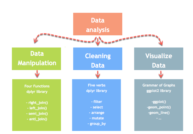R 有一个名为 dplyr 的库来帮助进行数据转换。dplyr 库主要围绕四个函数来操作数据和五个动词来清理数据。之后,我们可以使用 ggplot 库来分析和可视化数据。