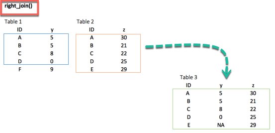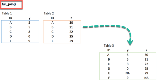 ## # A tibble: 6 x 3 ## ID y.x y.y ## <chr> <dbl> <dbl> ## 1 A 5 30 ## 2 B 5 21 ## 3 C 8 22 ## 4 D 0 25 ## 5 F 9 NA ## 6 E NA 29