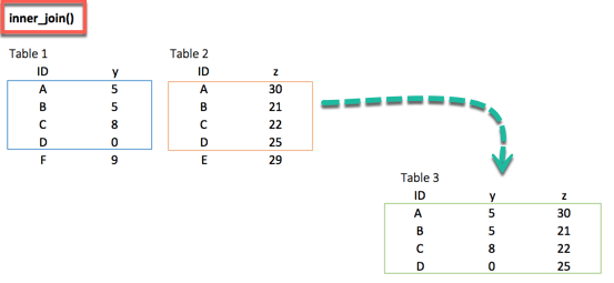 ## # A tibble: 5 x 3 ## ID y.x y.y ## <chr> <dbl> <dbl> ## 1 A 5 30 ## 2 B 5 21 ## 3 C 8 22 ## 4 D 0 25 ## 5 F 9 NA