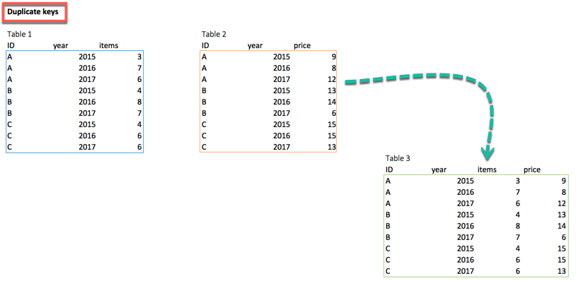 ## # A tibble: 9 x 4 ## ID year items prices ## <chr> <dbl> <dbl> <dbl> ## 1 A 2015 3 9 ## 2 A 2016 7 8 ## 3 A 2017 6 12 ## 4 B 2015 4 13 ## 5 B 2016 8 14 ## 6 B 2017 7 6 ## 7 C 2015 4 15 ## 8 C 2016 6 15 ## 9 C 2017 6 13