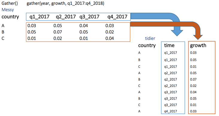 # Reshape the data tidier <-messy %>% gather(quarter, growth, q1_2017:q4_2017) tidier