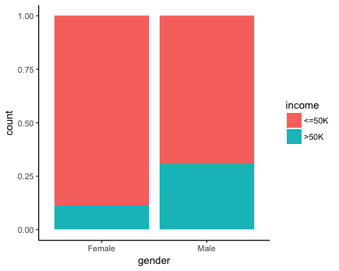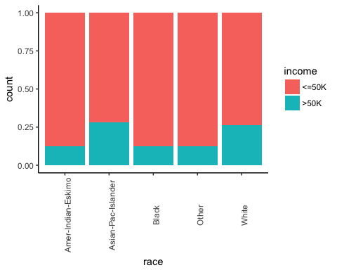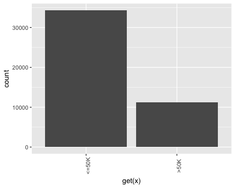 Observations: 48,842 Variables: 10 $ x <int> 1, 2, 3, 4, 5, 6, 7, 8, 9, 10, 11, 12, 13, 14, 15,... $ age <int> 25, 38, 28, 44, 18, 34, 29, 63, 24, 55, 65, 36, 26... $ workclass <fctr> Private, Private, Local-gov, Private, ?, Private,... $ education <fctr> 11th, HS-grad, Assoc-acdm, Some-college, Some-col... $ educational.num <int> 7, 9, 12, 10, 10, 6, 9, 15, 10, 4, 9, 13, 9, 9, 9,... $ marital.status <fctr> Never-married, Married-civ-spouse, Married-civ-sp... $ race <fctr> Black, White, White, Black, White, White, Black, ... $ gender <fctr> Male, Male, Male, Male, Female, Male, Male, Male,... $ hours.per.week <int> 40, 50, 40, 40, 30, 30, 40, 32, 40, 10, 40, 40, 39... $ income <fctr> <=50K, <=50K, >50K, >50K, <=50K, <=50K, <=50K, >5...